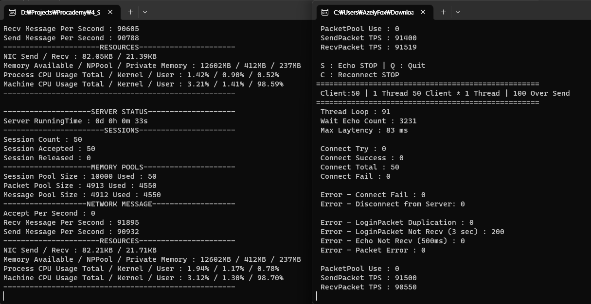 따라서 만든 네트워크 라이브러리를 에코 더미를 통해 검증되도록 한다면, 더욱 신뢰성 높은 네트워크 라이브러리가 될 수 있습니다. 에코 더미 또한 그저 단순한 에코 부하가 아닌, 여러 개의 세션을 가지고 서버로부터 핑퐁하지 않고도 여러 패킷을 보내보는 식으로 다양한 동작을 하게끔 한다면, 서버의 이상을 잡아낼 확률이 높아집니다.